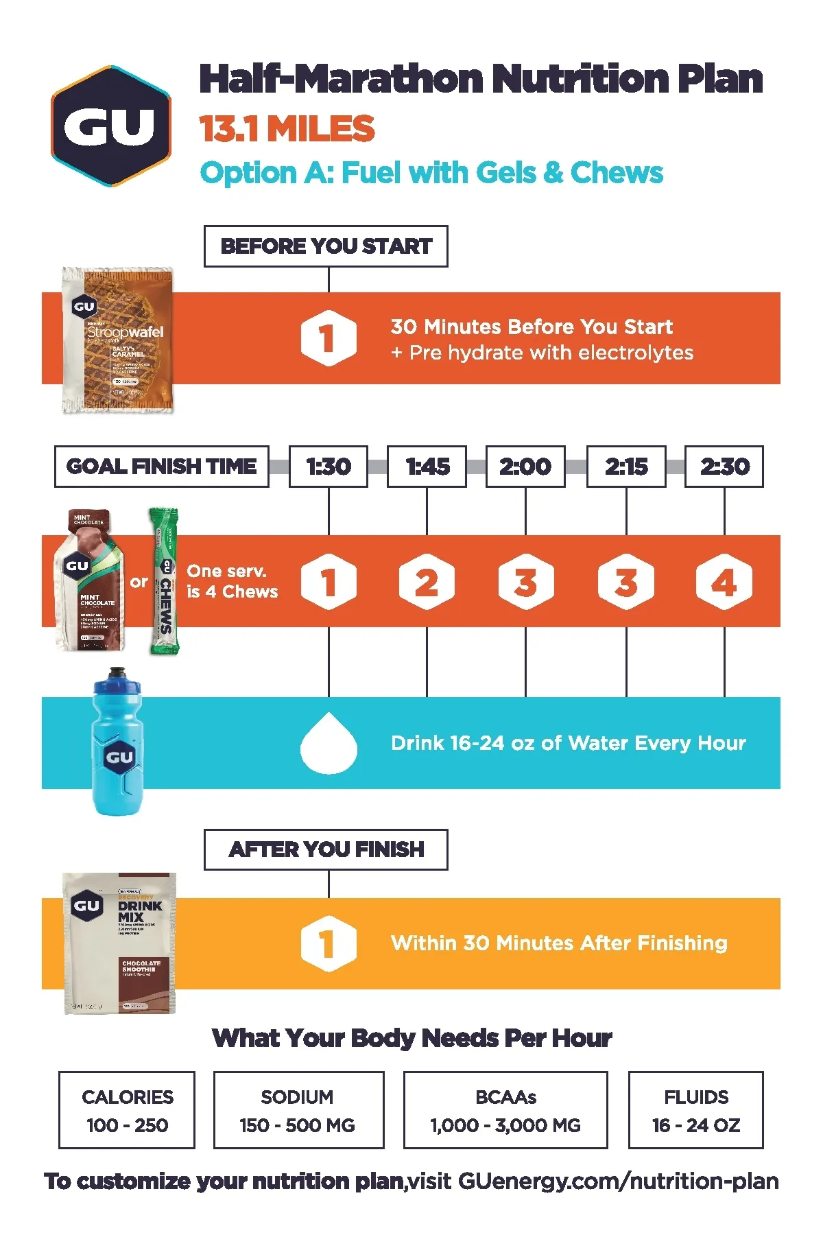 We pack 100 calories into our Energy Gels because, in general, the body can digest roughly 120-240 calories per hour during exercise. If you tried to eat more, the body would divert blood from your muscles back to the gut to handle the excess food/calories. If your metabolism is slower, then one Energy Gel every 45 minutes works just fine. If you have a faster metabolism, try ingesting one Energy Gel every 30 minutes and see if it agrees with your digestion system. We always recommend practicing your nutrition plan to determine what works best for you.
